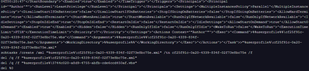 Once the XML file is complete, it is imported using “schtasks” to register the task with non-interactive execution settings. Immediately after task creation, the script deletes the XML file, the first VBScript used and itself from disk.
