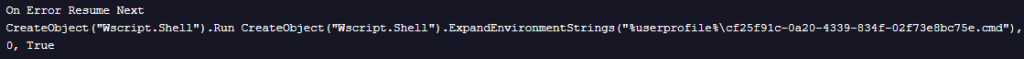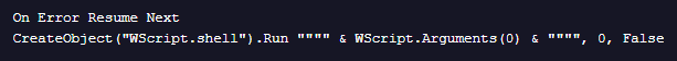 The VBScript used during the XML creation process consists of a wrapper that executes the file passed as an argument in a hidden window. It leverages “WScript.Shell.Run” with error suppression enabled to silently launch the supplied command without displaying any user interface.