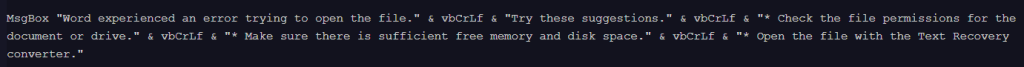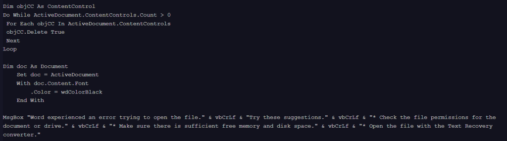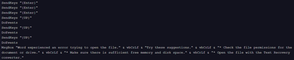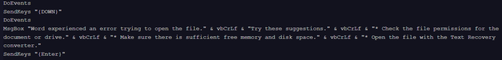 This variant, detected in December 2025, removes the specific document cleanup routines present in the earlier versions, but keeps displaying the fake Microsoft Word error message.