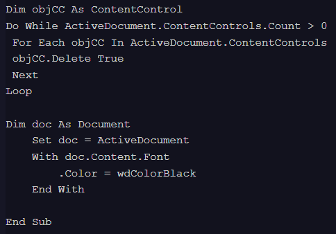 The earliest variant of the macro used, identified in late September 2025, is associated with the government-themed decoy document and is characterized by its final behavior: it iterates through the document to remove all ContentControls and changes the text color to black.