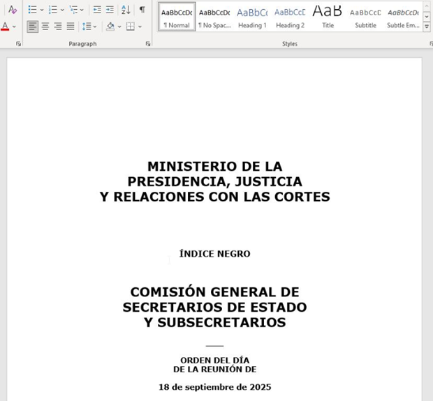 Multiple documents associated with this activity have been detected, featuring macros that differ slightly. One of these documents specifically used for spear-phishing was detected employing as a lure an alleged agenda issued on September 18, 2025, by the Ministry of the Presidency, Justice and Relations with the Courts of Spain. It’s a deliberately crafted and modified document that reproduces content from the agenda resolutions published on the official La Moncloa website on September 23, 2025.