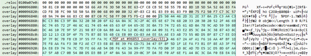 - The payload includes the decoy PDF within the overlay section. Embedding the decoy as part of the overlay is common in PlugX.