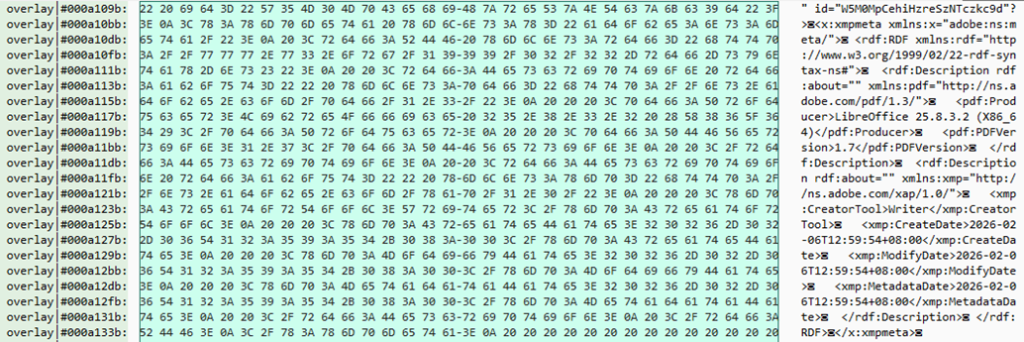 Finally, the injected DLL — decrypted from AVKTray.dat — embeds a decoy PDF within its overlay section, a technique that aligns with long-standing operational patterns associated with PlugX. Incorporating the decoy directly into the overlay allows the malware to present a convincing lure to the victim while keeping the malicious logic tightly coupled within the same artifact. This dual-purpose design reflects a mature development approach in which social engineering and technical execution are carefully integrated. Given the recurring use of PDF decoys in recent activity, this choice appears deliberate and consistent with the broader objective of maintaining credibility while minimizing suspicion during the early stages of compromise.
